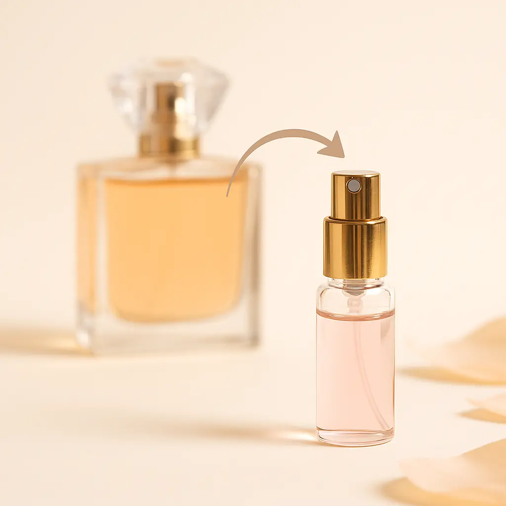 Un decant es una muestra de perfume original transferida a un envase más pequeño, ideal para probar una fragancia antes de comprarla en tamaño completo.
